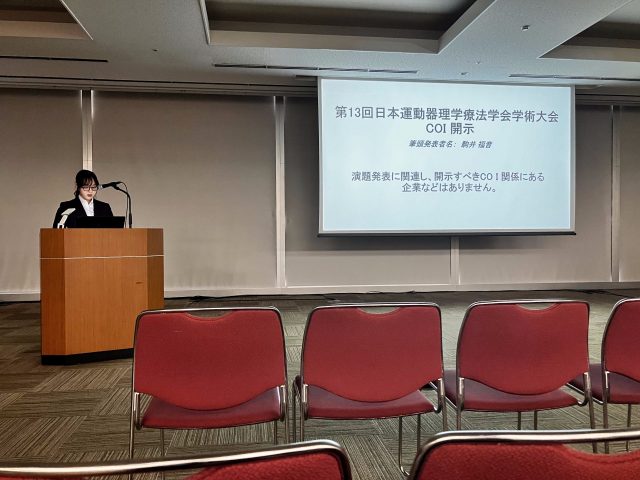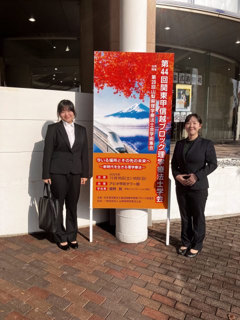 トップページ > 新着情報 > 研究 > 【研究活動】リハビリテーション学科の在学生2名が学会発表しました 【研究活動】リハビリテーション学科の在学生2名が学会発表しました2025年11月26日研究 第44回関東甲信越ブロック理学療法士学会(11月15日〜16日 山梨)、第13回日本運動器理学療法学会学術大会(11月22日〜23日 大阪)において、リハビリテーション学科4年の齋院麻夏さんと駒井福音さんが学会発表を行いました。 活躍する理学療法士との意見交換を交わす中で自身の研究価値や臨床意義について理解を深める機会となりました。 今後も学会発表をはじめ、在学生や卒業生の研究活動を支援してまいります。