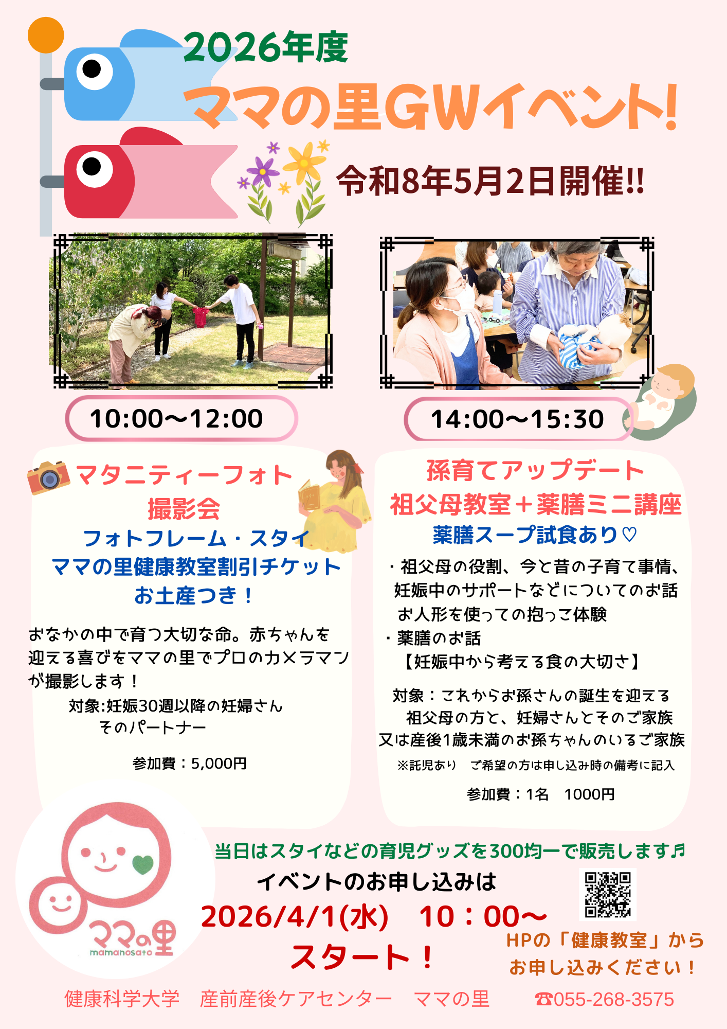 『告知!!』ママの里GWイベントのお知らせです☆ お知らせ | 2026年03月24日 健康科学大学産前産後ケアセンターGW企画を4/1~申し込み開始します! 5月2日 10:00~マタニティーフォト撮影会 14:00~孫育てアップデート祖父母教室+薬膳ミニ講座(薬膳スープ試食あり♡) (孫育て教室は参加人数を教えてもらいたいので、人数確認しておいていただきたいです) お申込みは、4/1 10:00~健康教室のページからお申込みできます。